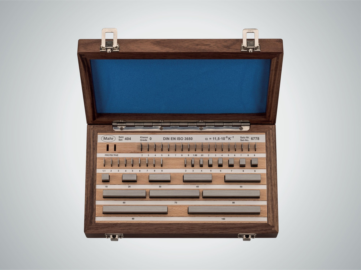 404 Jeu de cales-étalons parallèles en acier|46 Piècs|Classe de tolérance : 1|DIN EN ISO 3650|Caisse en bois avec étiquettes claires, Certificat d'étalonnage Mahr