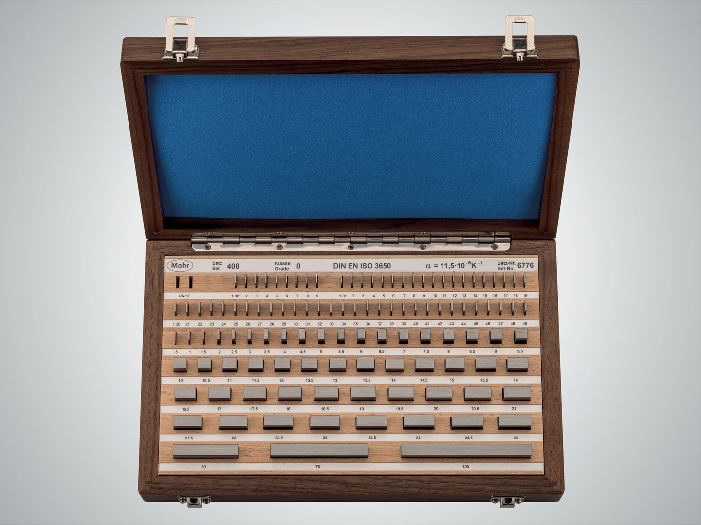 408 Jeu de cales-étalons parallèles en acier|111 pièces|Classe de tolérance : 1|DIN EN ISO 3650|Caisse en bois avec étiquettes claires, Certificat d'étalonnage Mahr
