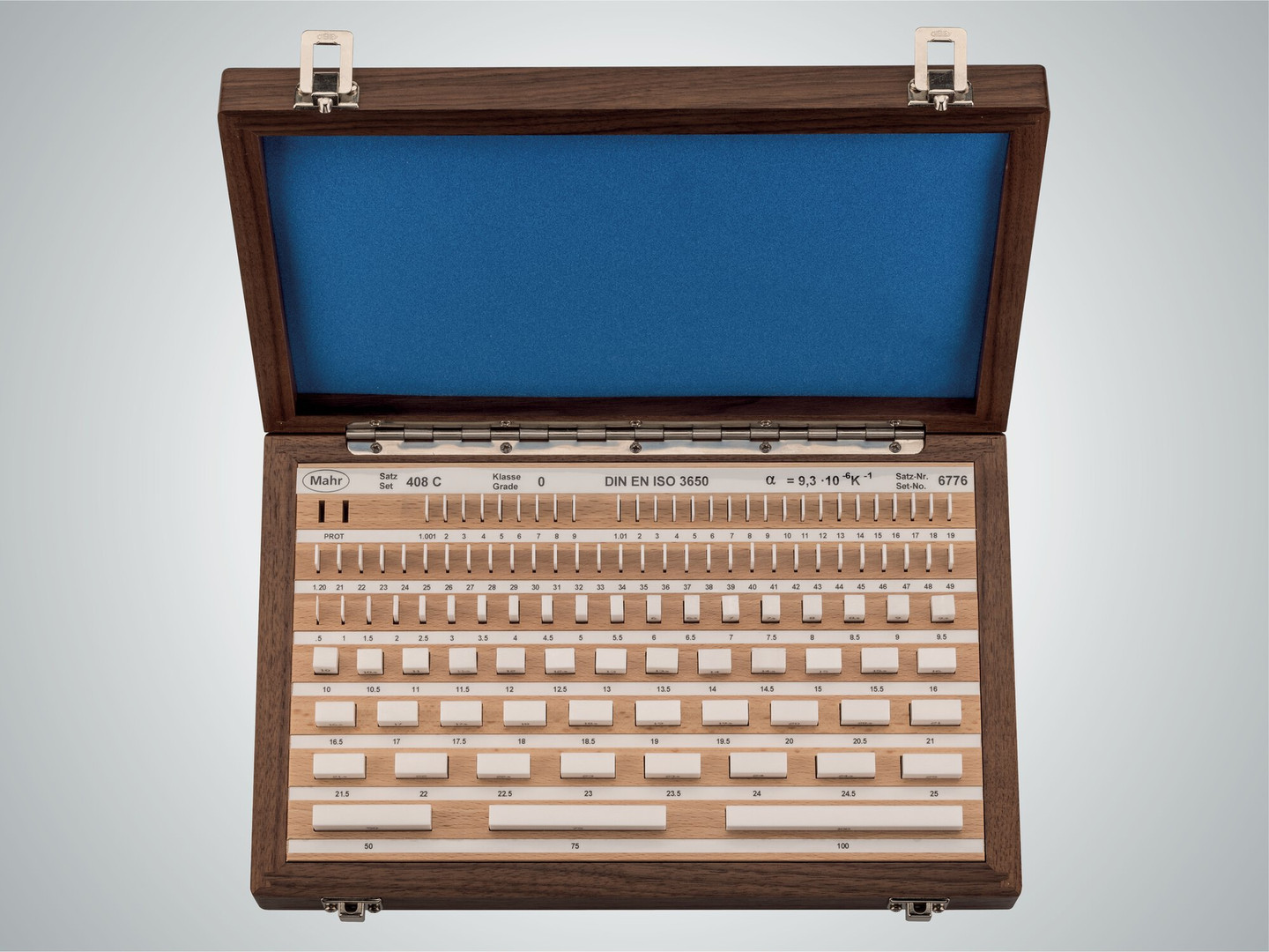 408 C/0/So Jeu de cales-étalons parallèles en céramique|112 Stück|Classe de tolérance : 0|DIN EN ISO 3650|Caisse en bois avec étiquettes claires, Certificat d'étalonnage Mahr