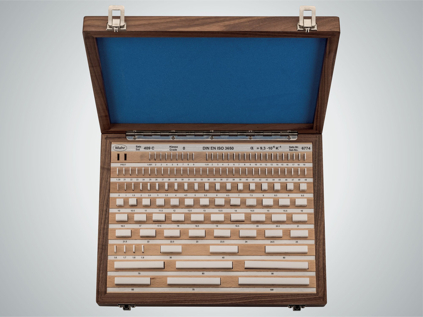 409 C Jeu de cales-étalons parallèles en céramique|121 Piècs|Classe de tolérance : 1|DIN EN ISO 3650|Caisse en bois avec étiquettes claires, Certificat d'étalonnage Mahr