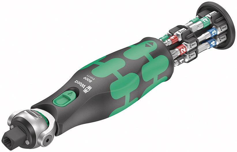 Modèle : association compacte d'un cliquet Zyklop pour douilles 3/8" et d'un jeu de tournevis pour embouts 1/4" avec prise directe magnétique. La tête verrouillable à 0°, 15° et 90° permet d'utiliser l'outil comme cliquet et tournevis à cliquet. Faible angle de reprise de 5° grâce à une denture fine de 72 dents. Réservoir d'embouts pivotant pour un retrait facile des embouts.