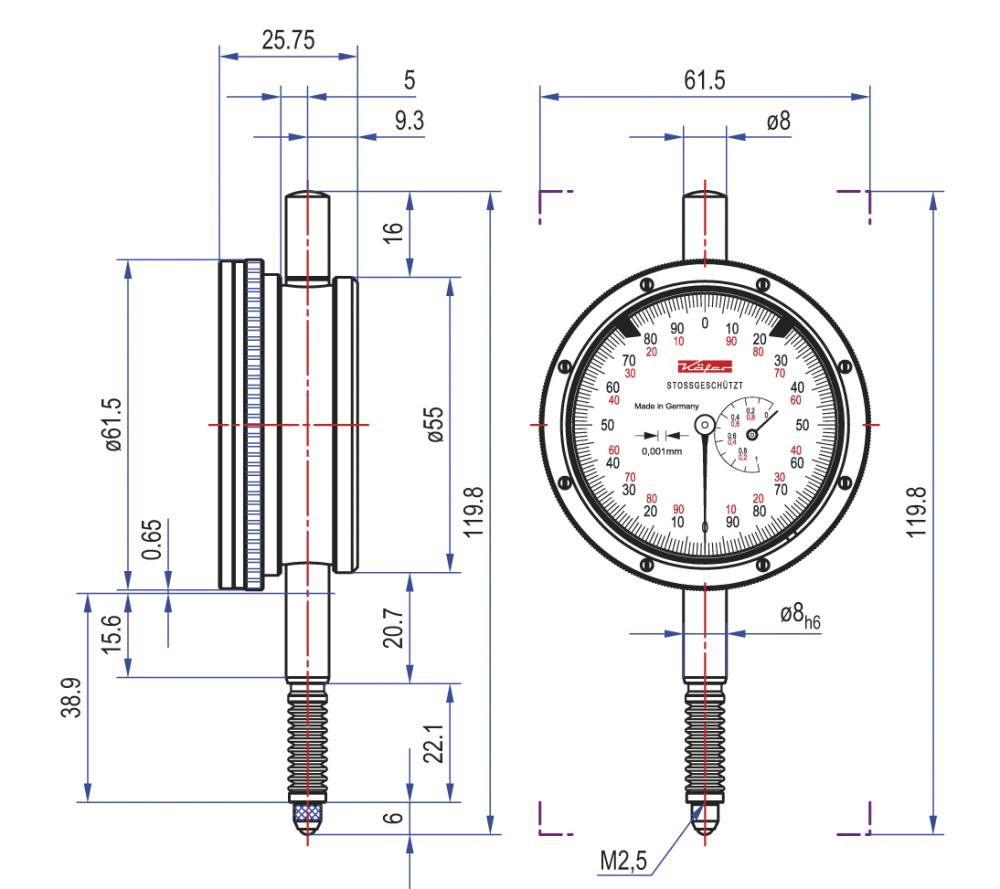 Modèle : avec protection antichoc , touche mobile et queue d'emmanchement (Ø 8 mm h6) en acier inoxydable robuste, touche mobile rodée. La douille au guidage précis située au-dessus de la touche mobile est disposée et montée sur ressort de telle sorte que les chocs ne soient pas transmis au mécanisme du comparateur. Avec soufflet en caoutchouc sur la touche mobile et joint torique sur le cadran et sur la face arrière pour empêcher la pénétration des liquides et des impuretés.