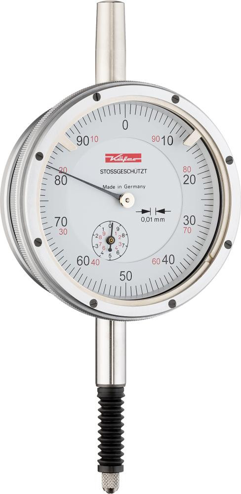 Modèle : avec protection antichoc , touche mobile et queue d'emmanchement (Ø 8 mm h6) en acier inoxydable robuste, touche mobile rodée. La douille au guidage précis située au-dessus de la touche mobile est disposée et montée sur ressort de telle sorte que les chocs ne soient pas transmis au mécanisme du comparateur. Avec soufflet en caoutchouc sur la touche mobile et joint torique sur le cadran et sur la face arrière pour empêcher la pénétration des liquides et des impuretés.