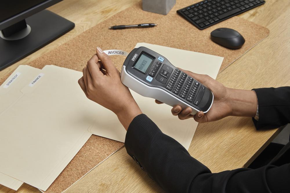 Livraison : étiqueteuse, ruban D1, noir sur blanc, 12 mm.