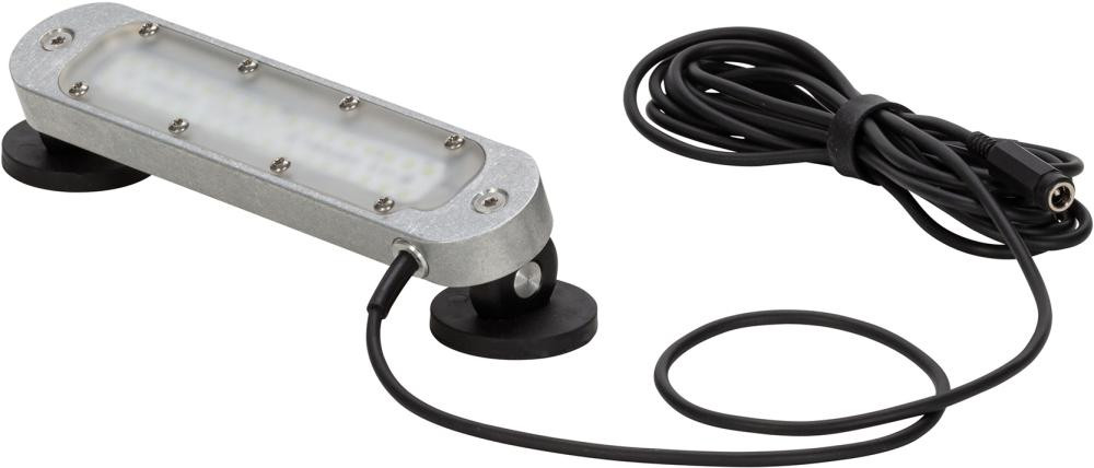 Modèle : tête de lampe en aluminium avec lentille acrylique satinée devant la plaquette d'éclairage LED. Éclairage antireflet sans éblouissement et sans vacillement, blanc lumière du jour (5500 K). Avec socle magnétique gainé de caoutchouc (Ø 43 mm, 100 N) pour un montage direct sur la machine. Protégé contre les projections de poussière et d'eau jusqu'à la fiche secteur. Câble de raccordement flexible de 3 m avec prise jack. Livré avec un bloc d'alimentation de 24 V avec fiche européenne et un câble de 1,8 m de chaque côté.