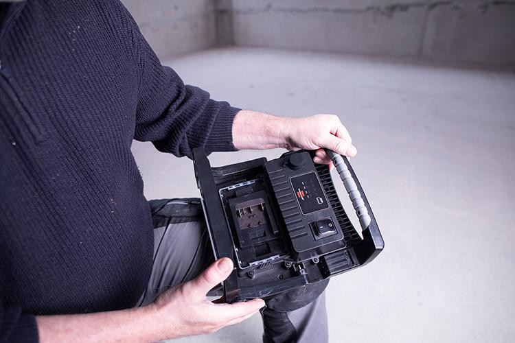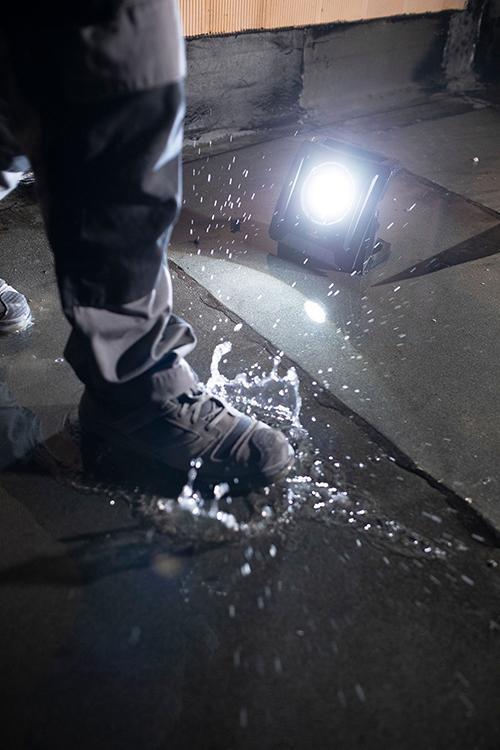 Modèle : boîtier métallique résistant aux chocs avec pied réglable et support pour trépied. LED COB spéciale pour un éclairage uniforme et de grande surface. Compatible avec batteries 18 V de Bosch, Dewalt, Festool, Flex, Makita, Metabo CAS et Milwaukee. Livré avec 4 adaptateurs d'interface, un câble d'alimentation et une pochette.