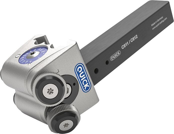 Modèle : porte-outils en acier traité. Stabilité maximale, corps de support monté par un serrage à méplat sans jeu. Unité de refroidissement QUICK adaptable et brevetée. Interface à queue d'aronde. Fixation/serrage du support de moletage extrêmement stable. Réglage simplifié de la tête grâce au marquage de la queue et de la tête. Unité porte-molette synchronisée. Livré sans molette de fraisage.