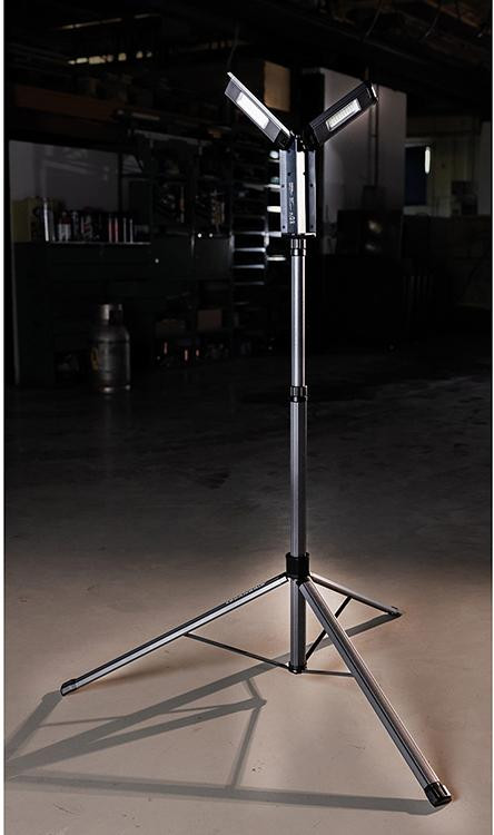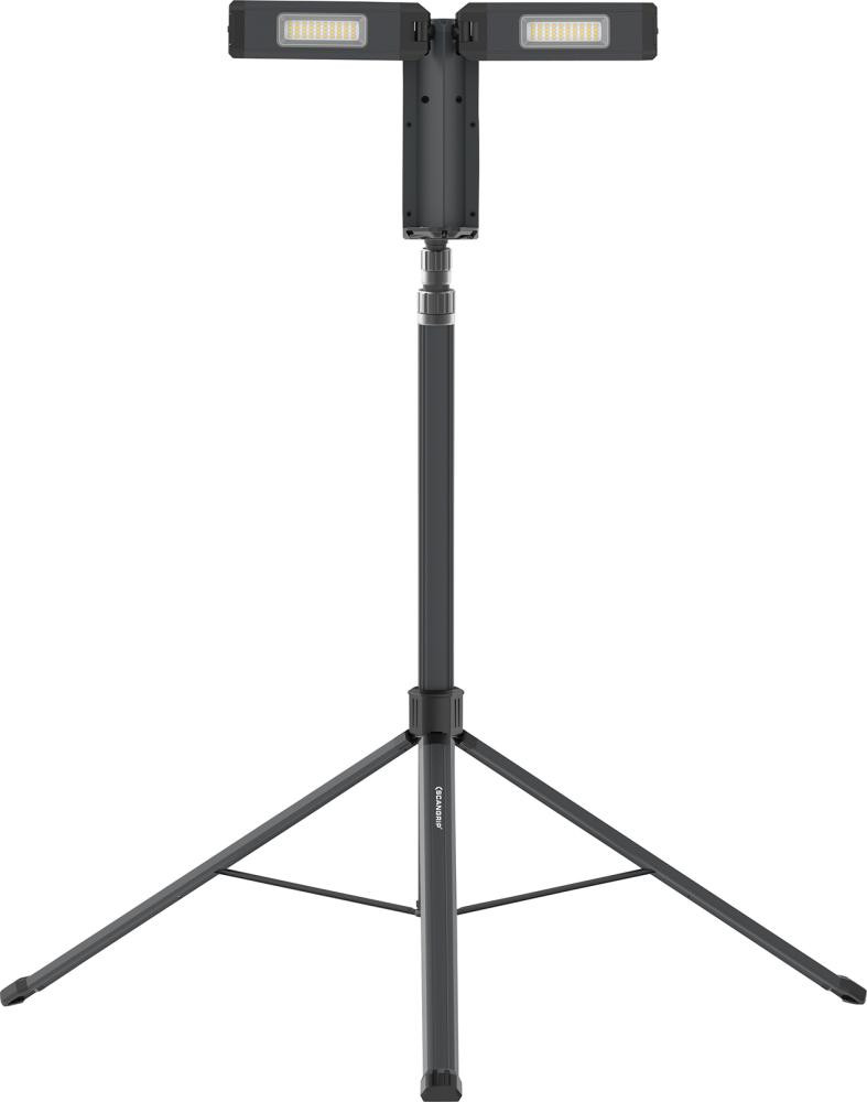 Modèle : boîtier en plastique résistant avec deux spots à rotation indépendante. Le projecteur se détache facilement du trépied, sans utiliser d'outils, pour être posée ou suspendue grâce au crochet intégré. Compatible avec les batteries 18 V basées sur le système CAS. Grâce à des accessoires vendus séparément, également compatible avec les batteries 18 V des fabricants d'outils électriques tels que Bosch (AMPShare), Dewalt, Fein, Festool, Flex, Makita et Milwaukee ou pour un raccordement direct au secteur pour une alimentation électrique continue. LED SMD pour un éclairage uniforme et de grande surface, angle de rayonnement 180°. Le trépied peut être facilement réglé à des hauteurs comprises entre 90 cm et 2 m à l'aide de fixations rapides. Livré sans batterie ni raccordement au secteur.