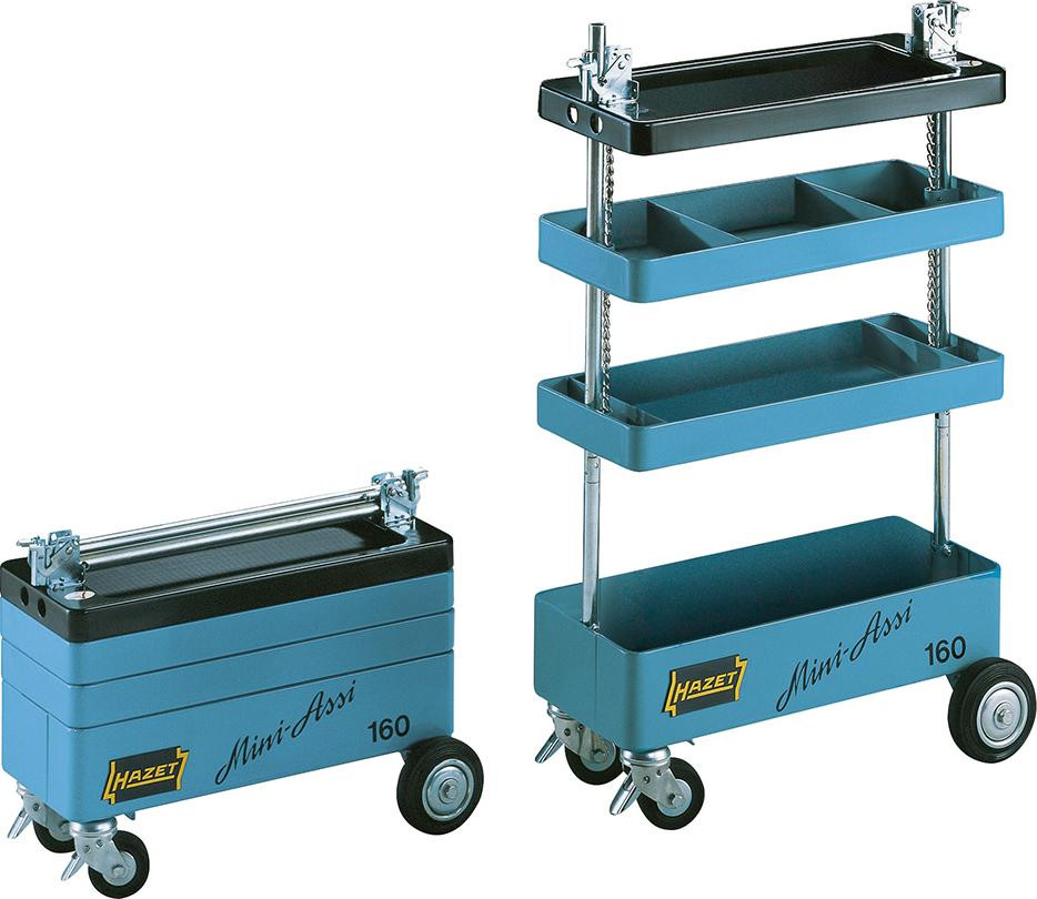 Modèle : chariot à outils, à matériel et de montage abaissable avec colonnes pivotantes pouvant également servir de poignée. Verrouillage centralisé par cadenas. Avec compartiment spacieux pour outils encombrants et deux niveaux intermédiaires. Particulièrement stable grâce aux 2 roues en caoutchouc plein, dont 2 roues pivotantes pouvant être bloquées. Surface avec revêtement par poudrage électrostatique anti-rayures bleu Hazet.