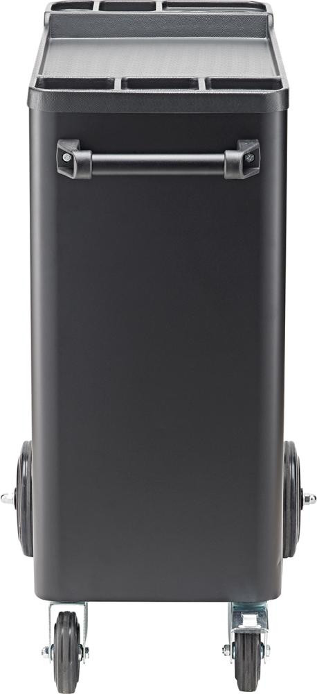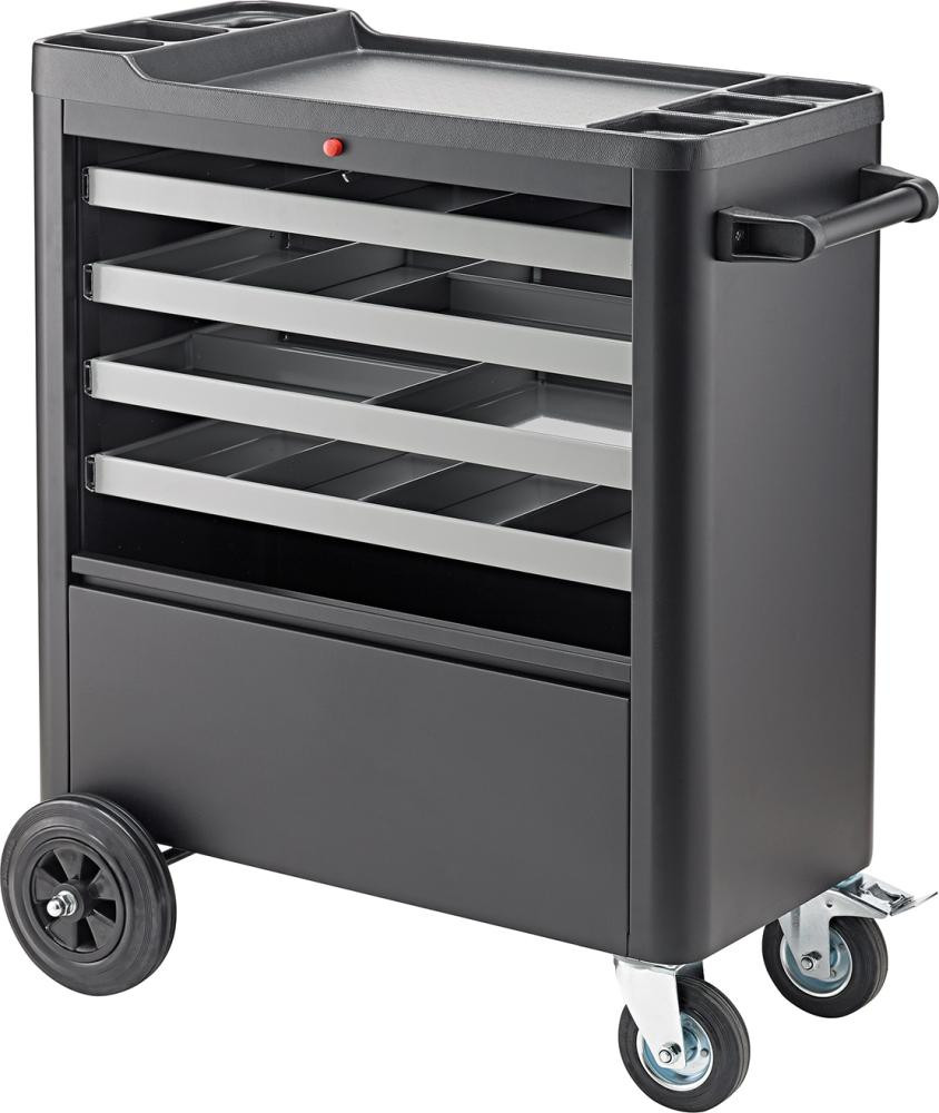 Modèle : construction robuste en tôle d'acier avec 4 tiroirs extensibles des deux côtés (4 x 75 mm de hauteur, tous subdivisibles individuellement) et rails de guidage sur roulements à billes. Grand espace de rangement avec tiroir dans le fond. Verrouillage centralisé par serrure à cylindre. Plate-forme de travail avec tapis en plastique. 2 roulettes fixes et 2 roulettes pivotantes, 1 roulette avec frein. Surfaces à revêtement par poudre, caisson noir, tiroirs gris.